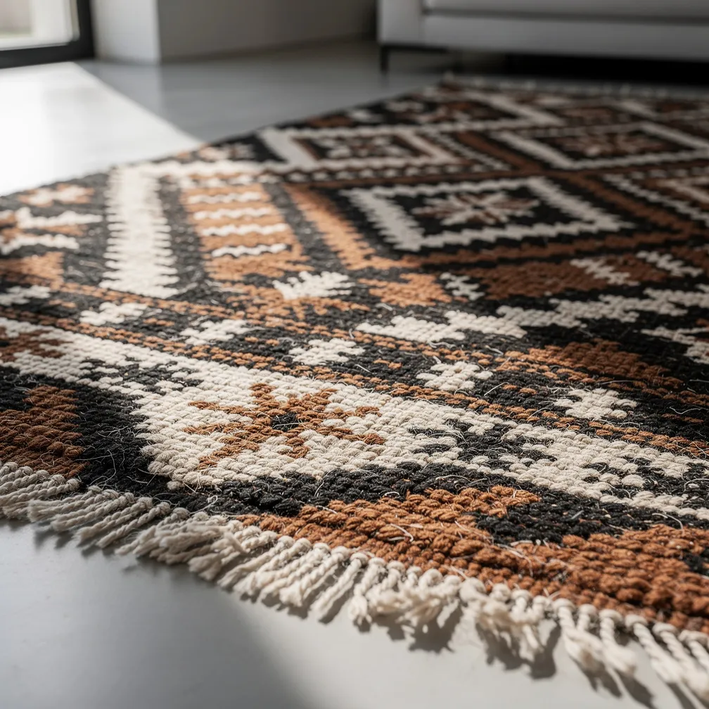 La région du Haut Atlas, particulièrement autour de Taznakht, produit certains des tapis berbères les plus recherchés. Les Ouaouzguite se caractérisent par leur esthétique minimaliste : fond écru ou noir, motifs géométriques épurés, souvent en simple contraste noir et blanc. Cette sobriété confère à ces pièces une modernité qui séduit les amateurs de design contemporain.